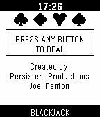 Blackjack for Pebble Classic player vs. dealer, single 52 card deck, no betting Designed for Pebble 2 Duo Open source code — github.com/Joel256/Pebble-Blackjack Made by: Persistent Productions - Joel Penton