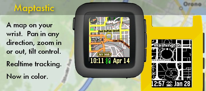 Imagine a map displayed on your wrist. Pans, zooms, and tracks your location. Customizable features include the mapping service, date, screen, vibration, connectivity, map labels, distance units, and more. Top button: backlight; bottom button: pans map based on watch tilt; flick/tap: distance; shake watch: refresh map. Tracking enabled until map is manually panned. New: long up button press for your current location address. Mapping tiles Copyright and courtesy of OpenStreetMap, OpenStreetMap contributors, Google Maps, ESRI ArcGIS, Stamen, Bing, and NOAA. Stamen data by Stamen Design (http://stamen.com); OpenStreetMap (http://openstreetmap.org) mapping tiles under Creative Commons licenses. See the instructional video for a demonstration of the Maptastic features.