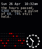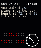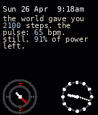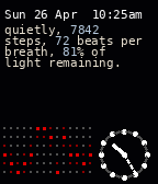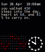 Literary is a watchface for people who find numbers cold. Time is spoken in words — half past nine, twenty to four — paired with a rotating literary fragment that changes every minute and shifts its structure every three hours. No two glances read the same. Your data is here too, but rendered as prose. Steps since waking. Power remaining. A date that sits quietly in the text. None of it shouts. At the bottom of the screen, a handcrafted dot-matrix analog clock occupies the right corner. To its left, choose your companion graphic: a smooth sine rhythm wave, an hourly step bar chart with the current hour lit white, a battery sparkline tracing the day's drain, or a red dot ECG — a heartbeat drawn in a 14×6 grid of coloured dots, scrolling one column per minute. Press SELECT to open settings. Choose your widget. Choose your font — compact, standard, bold, or large. Both choices survive reboots. Literary doesn't tell you the time. It describes it.