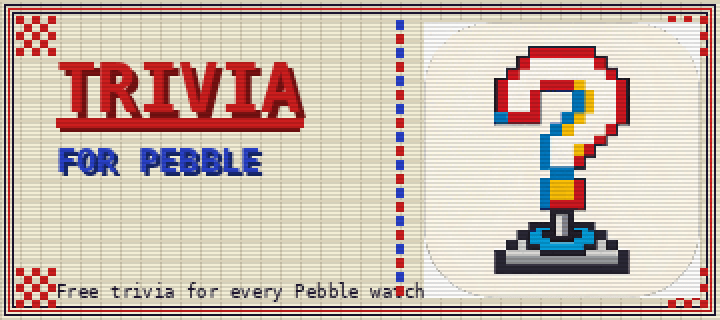 ❓ Pebble Trivia A trivia game for Pebble smartwatches. Questions pulled live from the Open Trivia Database — completely free, no account or API key needed. 🕹️ How to Play 1. Pick a category When you open the app you get a category menu. Choose what you want to be quizzed on: 🌍 All Topics — random questions from everything 🧠 General — general knowledge 🗺️ Geography — countries, capitals, landmarks 📜 History — historical events and figures 🔬 Science — physics, chemistry, biology, and more 🎬 Entertainment — movies, TV, music, books 🏆 Sports — athletes, teams, records 🐾 Animals — wildlife and nature ✅ True / False — quick true-or-false questions ⭐ Easy (Kids) — family-friendly easy questions 2. Pick a difficulty After choosing a category, pick how hard you want it: 🎲 Any Difficulty — mix of everything 🟢 Easy — beginner friendly 🟡 Medium — a solid challenge 🔴 Hard — for trivia nerds only 3. Answer the question The question appears on screen with four shuffled answer choices (A, B, C, D) — or just True / False for that category. Use the UP / DOWN buttons to scroll if the question is long. Press SELECT when you think you know the answer and the correct answer is revealed with a little vibration buzz. 📳 4. Score yourself honestly After the answer is revealed, it's on you to be honest: 👆 Press UP if you got it right — your streak goes up 👇 Press DOWN if you missed it — streak resets to zero ▶️ Press SELECT to skip without affecting your streak Your current streak is always shown in the top bar so you can track how hot your run is. 🔥 🎮 Controls On the question screen: UP / DOWN — scroll the question text SELECT — reveal the answer On the answer screen: UP — got it right ✅ (streak +1) DOWN — missed it ❌ (streak resets to zero) SELECT — skip, no streak change BACK — return to the difficulty menu ✨ Features 🌐 Live questions — fetched fresh from the internet every session, so you never run out 🔥 Streak counter — shown in the label bar as Geography x7, resets on a miss 🎨 Category colors — each category gets its own color on color-screen Pebbles ⚙️ Difficulty filter — fine-tune how hard the questions are per category ✅ True / False mode — a quick-fire category with simple yes-or-no questions 📜 Scrollable text — long questions and answers scroll smoothly ⌚ Round screen support — layout is adjusted for round Pebble displays 📱 All platforms — runs on every Pebble ever made 🔓 No account needed — completely free, no API key, no login ⌚ Supported Watches Runs on all 7 Pebble platforms covering every watch ever released: Pebble and Pebble Steel — original classics Pebble Time and Pebble Time Steel — full color Pebble Time Round — color, round screen Pebble Time 2 — color, large screen Pebble 2 SE and Pebble 2 HR — heart rate models Pebble 2 Duo — latest rectangular model Pebble Round 2 — large round color screen