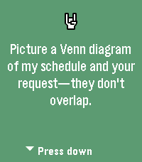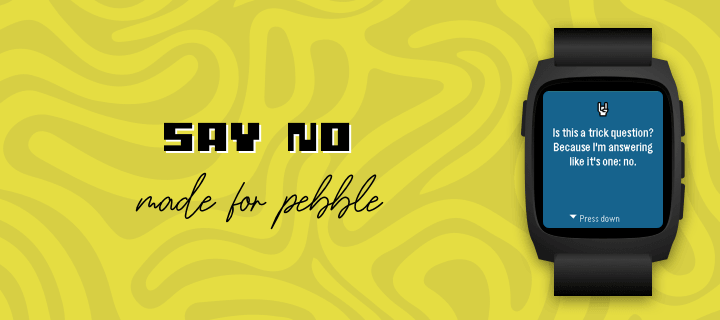 Tired of saying yes to everything? No. is the app for people who have finally embraced their inner introvert. Press any button on your Pebble and receive an instant, professionally-crafted excuse to decline whatever life throws at you. The background changes colors because even our pixels refuse to commit to one aesthetic. This release fixes a bug where the loading bar would spin forever, much like your excuses when someone asks why you skipped their party. We also taught the app how to actually talk to the internet, which turns out is pretty important for an app that fetches excuses from the cloud. Powered by NAAS (No As A Service) because of course that exists. Side effects may include free evenings, confused friends, and an overwhelming sense of peace. Not responsible for any bridges burned or family dinners missed.