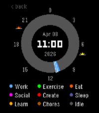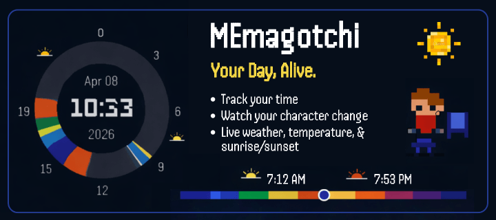 Your day, as a tiny living avatar. Switch activities, watch it change, and see your whole day at a glance—now with live weather, temperature, and sunrise/sunset references.