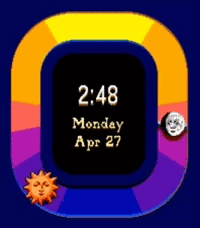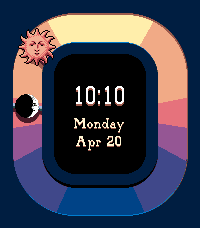 A watch face inspired by the "Celestial Whimsy" aesthetic, where the clock hands have been replaced with a live visualization of the sun and moon rising and setting. At solar noon, the sun will sit at the exact top center of the watch face, and it will sit at the bottom center at exactly solar midnight. The same is true for the moon, which will reach the top/bottom of the watch face during tidal noon and midnight. The current moon phase is also calculated and displayed live. The sunset/sunrise times (as well as relative amount of daylight for the current day) are visualized by sliding the color bars up and down the clock dial. The watch face reads your current GPS location from your phone's Pebble app when it starts up. But, after that, the calculation runs entirely on the watch, and it stores the most recent location in persistent storage, so it should continue to work even if your Bluetooth connection drops.