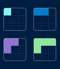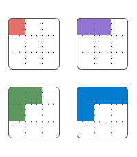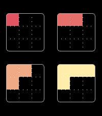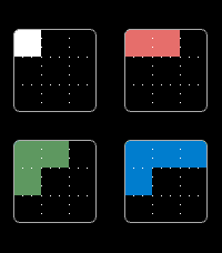 Four 3x3 grids with each filled-in square showing the time. Customizable colors throughout. Looks best on color displays, but supports black & white as well!