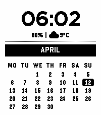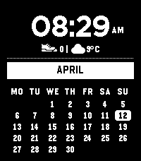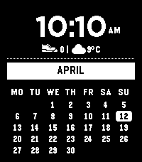 CalendaWatch: Your month at a glance. A retro calendar watchface. I wanted a full monthly grid on my wrist that actually looked good, was easy to read, and didn't kill the battery. -Full month calendar with today highlighted -Bottom stat is customizable: show your Steps, Distance, Battery, or Weather -12/24h time, Mon/Sun start days -Invert colors for a light mode layout Simple, functional, and built for everyday use.