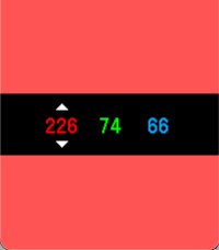 Color Picker turns your Pebble into a fast, tactile RGB playground. The screen fills with your current color, while bold red, green, and blue values sit centered on a clean black control bar. Start from a random color, tap SELECT to switch channels, and use UP or DOWN to fine-tune each value from 0 to 255. Hold a button to accelerate through values quickly and watch the full-screen preview update instantly as you dial in the exact shade you want.