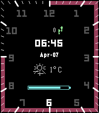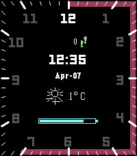 Minimalistic Hybrid watchface. Numbers change color to change the current hour and progress bar shows current minutes. It shows current weather temperature, battery and step count.