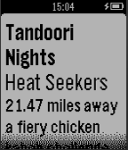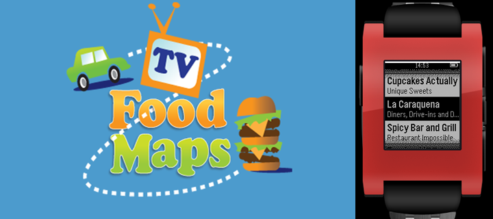 TVFoodMaps for Pebble is the very simple version of our website, tvfoodmaps.com, that allows you to find all the restaurants featured on over 40 different food and travel shows like Diners, Drive-Ins & Dives, Man v. Food and more. The app is very simple, it uses your current location to show you the 10 closest restaurants seen on TV. You can then click to see some additional information about each restaurant like how far away it is and what show it was on.