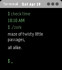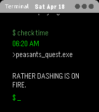 A "terminal" you'll actually enjoy using! Keep an eye on it, there's plenty of surprises. Shake to view weather and upcoming calendar events! It also has 4 theme options configurable from the Pebble app.