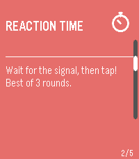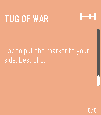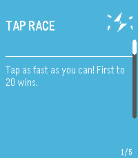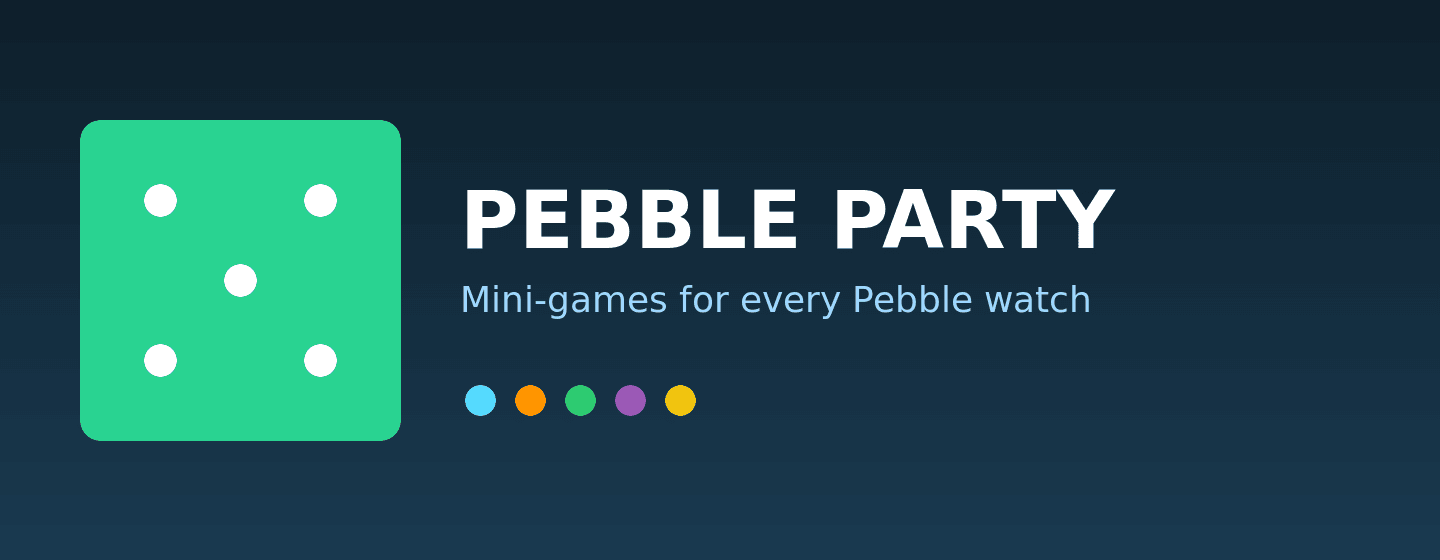 PebbleParty is a multi-game party app for Pebble smartwatches. Two players share one watch. Player 2 uses the UP button, Player 1 uses DOWN button and compete head-to-head in mini-games. Games: - Tap Race: Tap your button as fast as you can. First to 20 wins. - Reaction Time: Wait for a signal, then tap. Fastest reaction wins. Best of 3. - Memory Match: Watch a pattern, then repeat it back from memory. - Zero Hunt: Countdown starts and dissappears. Count in your head and tap as close to zero as possible. Best of 3. - Tug of War: Tap rapidly to pull a marker to your side. How it works: A card selector menu lets you scroll through games. Select a game, press SELECT to start (some games have a 3-2-1-GO countdown), then play. A results screen shows the winner with an option to replay or return to the menu. Display: In two-player games, the screen splits top/bottom. Player 2's text is rotated 180° so each player can read their half from opposite sides of the watch.
