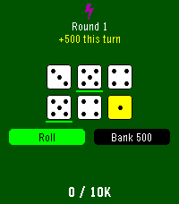 Choose 1-6 Player, pick an icon and randomize turn order. Keeps Score, auto selects, and registers High score with minimum turns. Hold Down anytime for reminder of scoring rules, or hold up to see players/order/score.