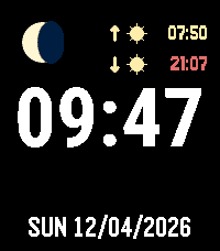 Watchface that provides current moon phase, sun rise / sun set, and with a flick of the wrist current tide for selected area.