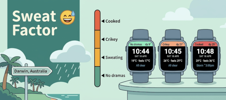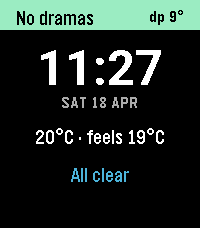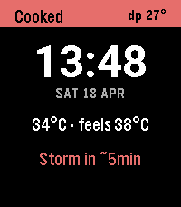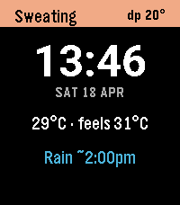 A Pebble watchface for tropical climates. Where temperature is nearly meaningless. Dew point and rain timing are what you actually care about.