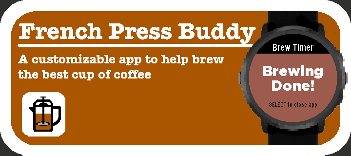 French Press Buddy is a simple, easy to use app to help you create the best French press coffee you can in 3 easy steps! 1. Select the roast of your coffee 2. Enter the amount of water you want to use. The app will automatically calculate the amount of coffee you need, based on your water amount and coffee type 3. Set the timer to how long you want to brew It's never been easier to make a cup of coffee with your pebble!