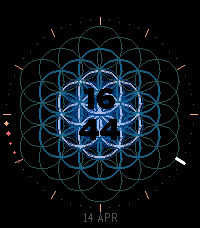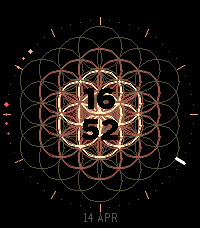 A living sacred geometry mandala for your wrist. Emanation renders the Flower of Life — one of the oldest and most sacred geometric patterns — as a luminous, breathing watchface. Thirty-seven interlocking circles radiate outward from a glowing center, their brightness graduating from a luminous inner Seed of Life to ghostly outer rings that fade into darkness. Beneath the circles, the 78 lines of Metatron's Cube trace the hidden geometric scaffold that connects all things. The mandala is alive. A warm central glow breathes slowly in and out. A red comet sweeps the outer ring each minute, its fading trail tracing the passage of seconds. At each minute mark, the inner circles flash white - a momentary bloom of light. The outer glow responds to your battery level, shrinking organically as power drains. Three color palettes shift automatically with the sun: - Night - crystalline blues radiating to silver-white, like frozen starlight - Golden - warm amber to luminous yellow, like geometry lit by candlelight - Day - cool teal to bright cyan-gold, precise and vivid Time is displayed as stacked hours and minutes in bold black numerals at the mandala's heart, with the date below. Twelve gold tick marks ring the outer edge, with the current hour highlighted in white. Every element serves the geometry — nothing is imposed on the pattern that doesn't belong. Features - Extended Flower of Life (37 circles, 4 rings) with Metatron's Cube - Breathing central glow and minute bloom animation - Red seconds comet with 6-dot fading trail - Gold minute ring with current hour indicator - Battery-aware glow and Bluetooth disconnect alert - Three auto-switching color palettes based on sun position - Configurable: show/hide time, seconds/minutes mode, manual palette override - Targets Pebble emery (rectangular) and gabbro (round)