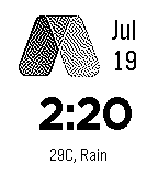 Digital watch with Aircloak logo, date, and local weather. Updates weather every 10 minutes, or when watchface refreshed. Says "Privacy Matters" when weather can't be updated.