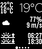 Displays current weather condition and temperature for your current location. Forecast for next hours and next 3 days. - 'select' button = middle button: toggle hourly and daily forecast - 'down' button: toggle precipitation and wind-speed forecast (dark green background: precipitation, blue background: wind) Data source: - daily conditions: Yahoo Weather - hourly conditions, precipitation and wind-speed forecast: OpenWeatherMap Precipitation values are predicted amounts of precipitation in mm, wind-speed is in m/s if you are on Celsius or miles/h if you are on Fahrenheit.