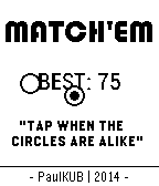 Match'em is a simple one touch game that will keep you entertained for hours. Tap when the circles are alike, else you lose. If you're looking for a challenge, Match'em is your best choice ! Update with new features coming in a few monthes, when the Pebble Time will be released.