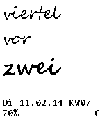 German fuzzy time with nice font showing date, calendar week, batterystate,bluetooth connectionstate and vibration if connection lost or reconnected. Rework of fuzzy time 2 - black text on white back