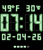 Time Weather Date Battery displayed on LCD font Weather display temperature and precipitation probability Time 12/24 Temperature F/C Color theme