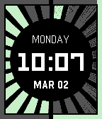 A radium dial watchface inspired by vintage glowing instruments. Tick marks fill to show minutes and hours, an outer ring tracks battery and steps, and a shake reveals — or hides — the digital clock beneath.
