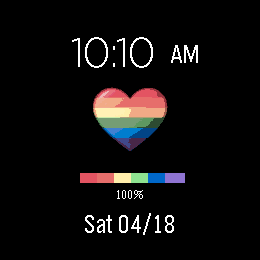 Just a simple pride themed watch face I made for the Time 2 Watch. It shows the time in 12 hour format, the Battery percentage in a rainbow bar, and the date.