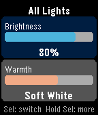 In Color Mode, the Warmth slider shows your chosen color. Press UP or DOWN on Warmth to return to white light.