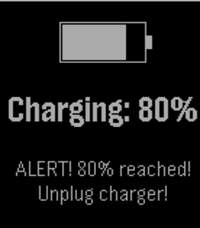 Get notified when you charge your pebble and the battery level reaches 80%. This way, you can manually interrupt the charge. Preventing batteries to charge completely has been proven to improve their capacity degradation. When 80% charge is reached, the pebble will display a message and vibrate repeatedly. Additionally, you can configure your pushbullet access token or a custom webhook in the settings so that you get a remote notification as well.