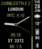 Design and Art Direction by Paul Joel - www.pauljoel.com CobbleStyle is back! This time with THREE modes to display the time: analog, digital or BIG TIME! With complete customization on what information you want displayed. With pre-designed color sets and complete color customization. Make CobbleStyle 2 how you want it! Key features: - Three Ways to display the time: Analog, digital, or BIG TIME! - Multi-language support - Anti-aliasing text and graphics. - Date / Weather / Bluetooth connection. - GPS Location. - Week number. - Local time. - Alternative timezones. - AM/PM. - Seconds counter. - Pre-designed color sets. - Custom colors. - Custom text. - Backlight when charging option. - Bluetooth alert options. - Weather provided by Open Weather Map INFO ON API KEYS: http://tinyurl.com/weapi Health Info: - Step Count - Live step goal bar. - Custom step goal. - Distance Walked - Time Active - Calories burned at rest - Calories burned while active - Heart rate (if supported by the watch)