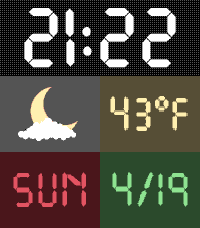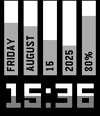 Unique watchface design, showing - day of the week - month - date - year - battery percentage in vertical columns, plus time in large digits. Progress bars show time advancements, and battery discharge. Tap on the watch to see health metrics* - step count - distance walked - calories burned - time active - heart rate Each metric shows progress toward the goal (except heart rate, which is percentage of 250, don't try to reach it) which is average of your achievements from prior days. Large white time also show time progress thru the day as they're gradually filled with gray. Configurable options include - Whether to show time progress by filling numbers with gray - Timeout to automatically return to main screen from health screen *not applicable to original Pebble, and Pebble Steel.