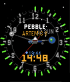 Earth (hour hand) · Moon with 5-sec blink (minute hand) · Orion capsule (center)
