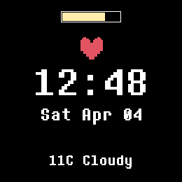 a watchface built with Alloy, inspired by undertale. features: - 7 soul colours, one for each day of the week - date and time - weather - battery (health bar)