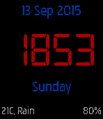 A simple red and white watchface. Weather, time, date are displayed diagonally, battery and bluetooth are placed at opposite corners. Different colour variants in the works, stay tuned!