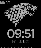 You are fan of Game of Thrones? This watchface is for you! It displays the Stark' House logo, the time (24h), the date and a dotted line indicating the battery level at bottom. The "Bth Off" appears at top left if you loose connection with your phone (also vibes).