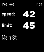PebFoot is a GPS speed tracker that monitors your speed and alerts you when you exceed posted speed limits. Using OpenStreetMap data, PebFoot automatically detects speed limits and gives your wrist a buzz before your wallet takes a hit.