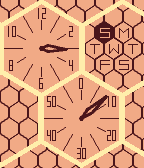 A watchface with tessellating hexagons. The top left hexagon shows an analog hour dial. The bottom center hexagon shows a minute dial. The top right hexagon highlights the day of the week.