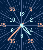 Clearly show the time & date. Primarily analog, with digital hints. For color displays, use a different color for hours vs minutes. Avoid overlapping when the hands are near each other by moving the minute numbers.