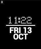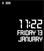 When the bluetooth connection is lost, the watch will vibrate and the screen colors will invert. Battery status indicator Bluetooth status indicator Digital 12/24h watchface Day (long format) Date Month (long format) Thanks to http://www.watchface-generator.de/ for enabling this watchface.