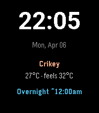 A Pebble watchface for tropical climates. Where temperature is nearly meaningless. Dew point and rain timing are what you actually care about.