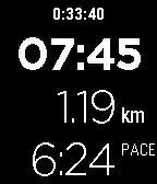 The app shows the time, distance and pace of your run as well as the wall time. Press Select to start/pause/resume your run. While running, it shows your current pace. Wile paused, it shows your overall (average) pace. The app doesn't save any data about your previous runs. At the moment, the distance can be shown in kilometers but not in miles.