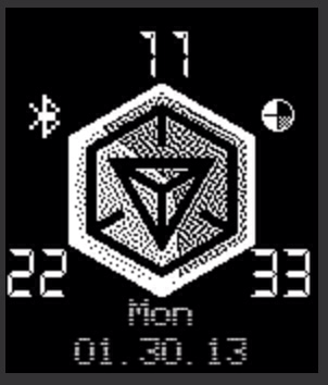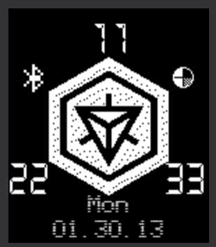 Inspired by the mobile AR Game Ingress, created on the Watchface Generator, and designed by Maxxavier Santiago-Resto the face shows the hour on the top most corner, Minutes on the bottom Left, and seconds on the bottom right, Day, and date are located bottom center, with watchface Inversion when bluetooth is disconnected.