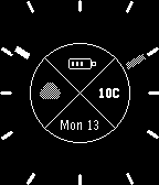 Analog watchface with a four-slice center for battery, weather, temperature, and date.