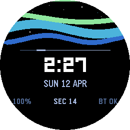 A premium utility-first watchface with an aurora borealis visual design. Features - Animated aurora bands — three layered sine-wave bands (violet, teal, green) that flow and pulse in real time - Star field with subtle twinkling above the mountain horizon - Mountain silhouette with snow caps (rectangular display) - Live second sweep — an accent-coloured pulse travels across the divider every minute - Time-of-day accent colours — amber at morning, sky blue by day, violet at night - 12h / 24h time support, auto-detected from watch settings - Status row: battery level, live second counter, Bluetooth connection state - Battery indicator bar along the top edge with low-battery and charging alerts - Supports both Pebble Time 2 (emery) and Pebble Round 2 (gabbro)