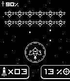 A Space-Invaders style watchface. Credit to "Rhys Davies" for the original idea / artwork. Character in the top left indicates bluetooth connectivity. If he goes away, you've lost connection. The percentage adjacent to that is the Pebble's battery status. The numbers in the bottom left and bottom right are hour and minute, respectively.