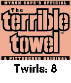 Cheer on the Pittsburgh Steelers and track how many times you're twirling that Terrible Towel. Yoi and double yoi! It should only count for twirls and not steps. Everyone twirls differently so over time I hope to optimize the accelerometer logic for all members of Steeler Nation. Press the down button to reset. Here We Go Steelers!