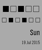 A simple 24hour binary clock. Hours in the top row, minutes in the middle. The MSB is on the left, for hours 16 and minutes 32. Also shows the day and date.