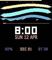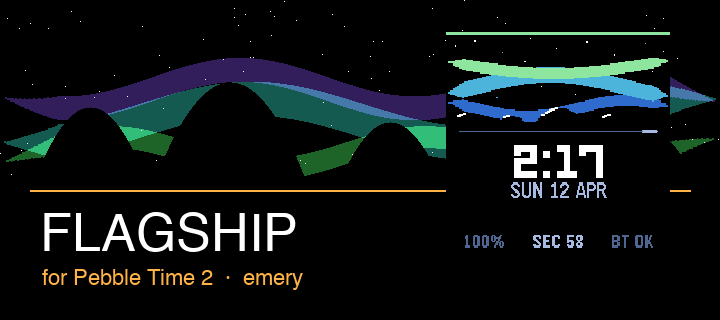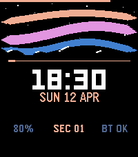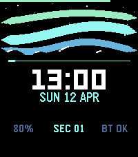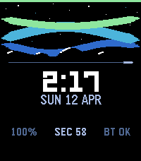 A premium utility-first watchface with an aurora borealis visual design. Features - Animated aurora bands — three layered sine-wave bands (violet, teal, green) that flow and pulse in real time - Star field with subtle twinkling above the mountain horizon - Mountain silhouette with snow caps (rectangular display) - Live second sweep — an accent-coloured pulse travels across the divider every minute - Time-of-day accent colours — amber at morning, sky blue by day, violet at night - 12h / 24h time support, auto-detected from watch settings - Status row: battery level, live second counter, Bluetooth connection state - Battery indicator bar along the top edge with low-battery and charging alerts - Supports both Pebble Time 2 (emery) and Pebble Round 2 (gabbro)