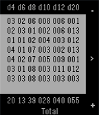 A simple dice roller for tabletop RPGs. Roll every type of dice at once, no more fumbling through menus to get the roll you want. Use top and bottom buttons to add or remove rows on the roll table, and press the middle button to roll everything. Result Formulas Long press the middle button to cycle between formulas for the result row - Total, Highest, Lowest, Remove Highest, Remove Lowest. Reroll Modes Toggle Reroll modes via long press of the bottom button. This lets the app accommodate "Brutal" rolls and other similar logic. Rerolls are handled before everything else in the logic chain. Reroll Modes (shown in bottom left when active): Rm1: Reroll dice showing the minimum value once RmX: Reroll any dice showing the minimum value recursively until no min value dice are rolled RM1: Reroll dice showing the maximum value once RMX: Reroll any dice showing the maximum value recursively until no max value dice are rolled Replace Modes Toggle Replace modes via long press of the top button. This lets the app accommodate "Confidence and Desperation" rules found in some PbtA systems, and similar logic. Replacements are handled after all Rerolls are completed, but before the selected formula is calculated. Replace Modes (shown in bottom right when active): m>M: Replace Min value rolls with Max value M>m: Replace Max value rolls with Min value Quick Reset A quick press of the top button when only one row of dice is active will reset all formula, reroll, and replace modes to their default values, letting you "clear the table" and start fresh. Supports a max of 8 dice per type per reroll. Hoping to get rid of all the leading zeroes in a future update, but there's no monospace blank character to my knowledge.