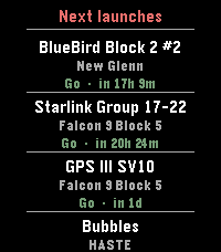 LaunchPad brings the world's rocket launch schedule to your Pebble. Scroll through the next 10 upcoming orbital launches, each showing: * Mission name — what's flying (BlueBird, Starlink, GPS III ) * Rocket — which launcher (Falcon 9, New Glenn, Electron…) * Status & countdown — color-coded Go / TBC / TBD with a human-readable time like "in 17h 1m" or "25 Apr · 14:00Z" App is pure alloy, data comes live from Launch Library 2 by The Space Devs — the same open database that powers many of the best space-tracking apps. Credit: launch data provided by thespacedevs.com