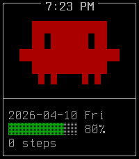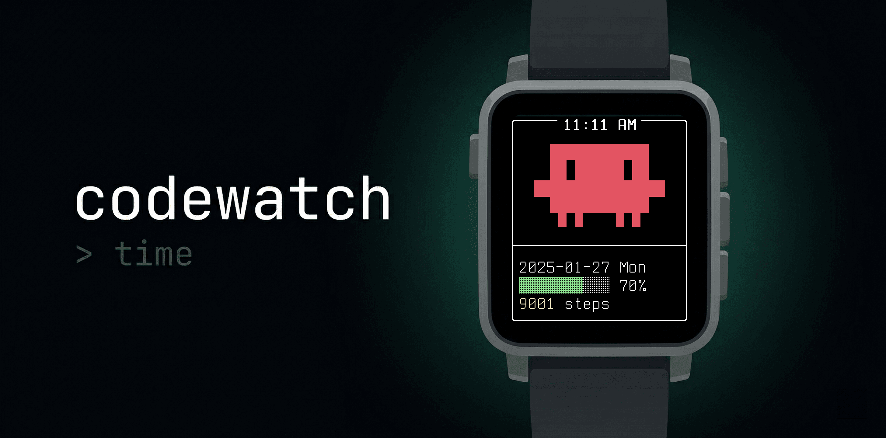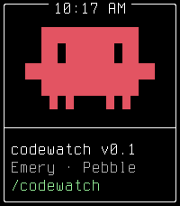 codewatch puts your coding buddy on your wrist. A terminal-aesthetic watchface inspired by Claude Code, featuring the code creature that lives on your screen and a slash command system that fires on a flick of your wrist. Features: - Wrist flick runs the creature's slash commands - Over 30 commands — live stats, fun responses and more - Animated startup screen - Terminus monospace font throughout - Homescreen features the code creature, along with current time, battery level and step count - Supports Emery (Pebble Time 2) and Gabbro (Pebble Round 2) Inspired by Claude Code. Keywords: terminal, claude, claude code, code, creature, pixel art, terminus, monospace, stats, steps, slash commands, cli, hacker